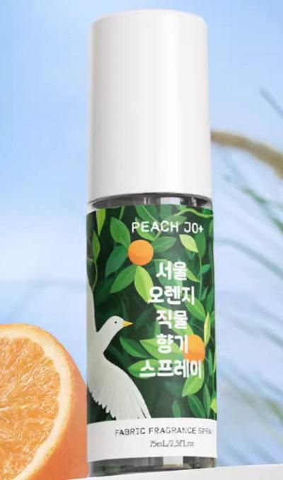 This fabric fragrance spray from Seoul features a orange scent. Fabric fragrances like this are used to freshen textiles with a pleasant, long-lasting aroma.